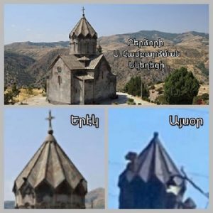 Власти Азербайджана не ограничиваются уничтожением древних армянских памятников Шуши. Сейчас они приступили к деарменизации армянских монастырей и церквей других оккупированных армянских районов, в частности церквей Бердзора (Кашатага) — Лачина. Вот только одно подтверждение сказанного: