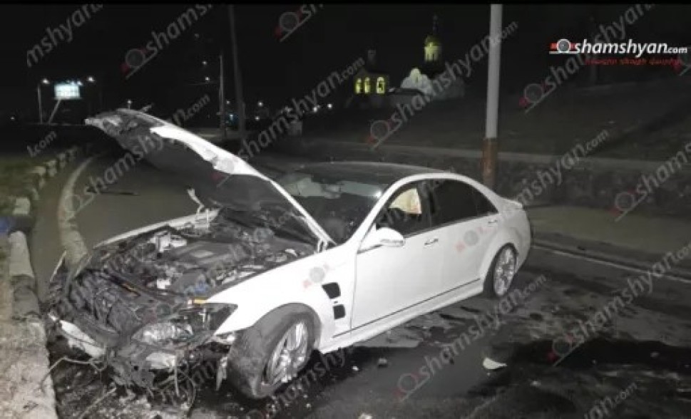 Երևանում «Mercedes»-ը բախվել է ցուցանակին ու հայտնվել ճանապարհի մեջտեղում