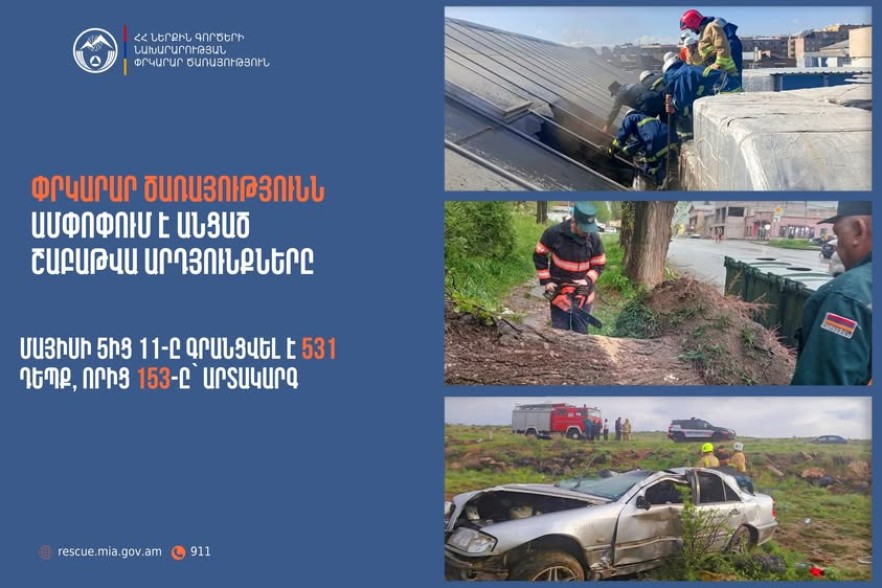 Մայիսի 5-ից 11-ը ՆԳՆ ՓԾ ճգնաժամային կառավարման ազգային կենտրոնում գրանցվել է 531 դեպք, որից 153-ը՝ արտակարգ: Մասնավորապես՝ հրդեհի՝ 72, փլուզման, պայթյունի, կենսաապահովման կոմունալ համակարգերում վթարի, հեղեղման, դարափուլի, քարաթափման, որոնողափրկարարական, դժբախտ պատահարի՝ 1-ական, ուժեղ կարկուտի՝ 2, տեղատարափ անձրևի՝ 6, դիակի և զինամթերքի հայտնաբերման՝ 4-ական, թունավորման՝ 8, օձի նկատման՝ 25, կեղծ ահազանգի՝ 23, ուժեղ քամու՝ 10, ինքնասպանության […]